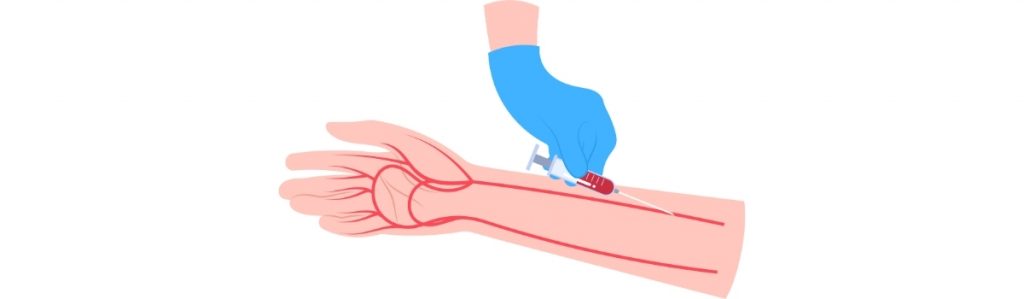 Après pose du garrot et repérage veineux, une antisepsie cutanée large est réalisée avec une solution alcoolique.